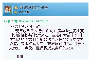 疾病无情人有情,曾就读环境工程学院的2006级学生汤晓夏,现就读于江苏大学环境学院学院研究生三年级,被确诊为白血病的消息传来后,环境学院党政领导高度重视,在学院内组织了捐款活动,共募捐救助金8000元。