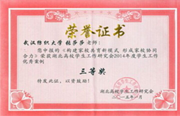 5月22日至5月23日,湖北高校学生工作研究 2015年年会暨大学生思想政治教育工作创新论坛 在武汉东湖学院举行,教育部思政司思政处处长 江嵩围绕辅导员队伍建设做主题报告,省教育厅 思政处处长何泽云部署了2015年高校学生教育和 管理重点工作,来自湖北省100多所高校分管学 生工作的校领导和学工部门的代表200多人参会 。我院张莎莎老师申报的《构建家校共育新模式,形成家校协同合力》荣获湖北高校学生工作研究会2014年度学生工作案例省三等奖。