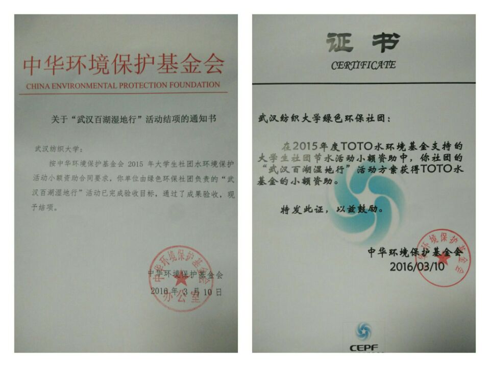 近日,从中华环保基金会传来消息,我校绿色环保协会申报的“武汉百湖湿地行”项目已结项并通过环保基金会验收,获得TOTO水基金小额资助。