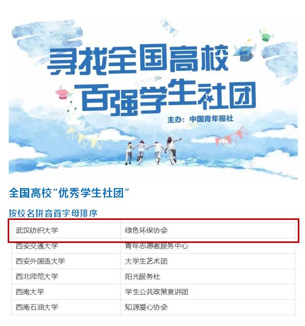 近日,由中国青年报社主办的“寻找全国高校百强学生社团”活动落下帷幕,经过高校推荐、社团自荐、社团展示、网络投票、技术筛查、专家评审等环节,我校绿色环保协会从全国2950个参评社团中脱颖而出,荣获全国高校“优秀学生社团”,协会指导老师姚瑶荣获“优秀指导教师”称号。