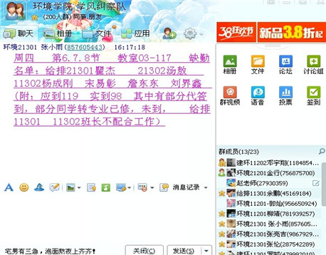 环境工程学院辅导员每天查课4次,“学生督察小组”每天查课4次。查课情况一份交给任课老师作为平时成绩,一份交给辅导员作为学生管理依据。学生旷课情况实时在线反馈到学生工作办公室,辅导员对学生进行督导和教育;实时反馈到班级QQ群,学生干部有针对性的加强班风建设。环境学院辅导员还对学生出勤情况进行统计,每周旷课较多的同学,通过家长QQ群、短信或电话的方式与家长保持密切联系,共同开展教育管理。