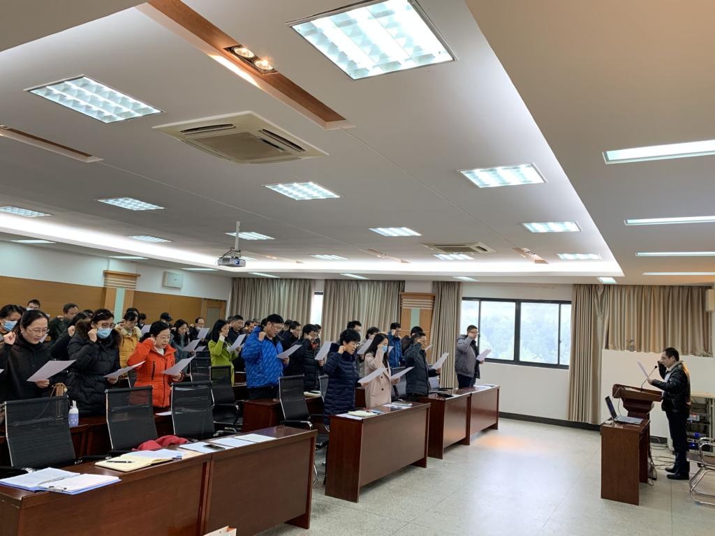潘飞副院长宣读《武汉纺织大学师德师风公开承诺书》,并带领大家庄严宣誓。全体教职工郑重承诺一定政治坚定,爱国守法;教书育人,爱校敬业;为人师表,关爱学生;严谨治学,廉洁自律;崇尚科学,终身学习。一定会认真履行教师职责,严格遵守《新时代高校教师职业行为十项准则》,形成良好的师德师风,争做一名有理想信念、有道德情操、有扎实学识、有仁爱之心的“四有”好老师。