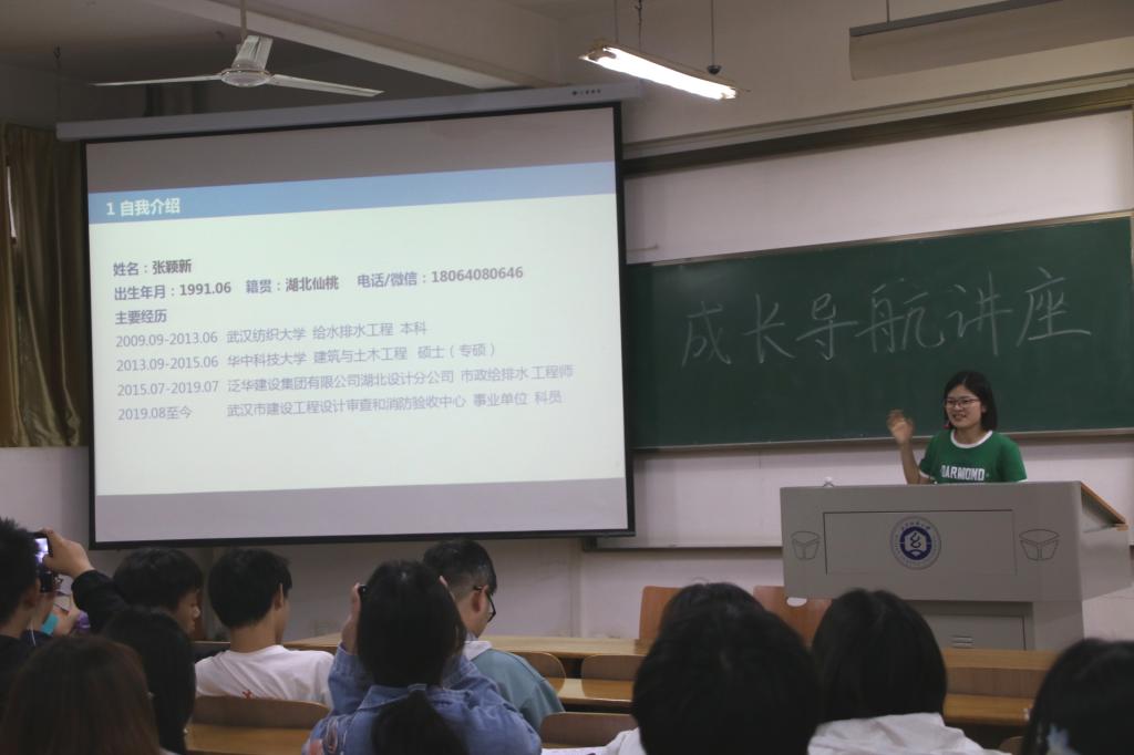 5月16日晚,我院成长导航讲座在崇礼楼111教室举行,邀请我院09级校友、武汉市建设工程设计审查和消防验收中心工程师张颖新,以“走出迷茫,坚定前行”为主题,为在场一百余名学生带来了一场精彩的讲座。