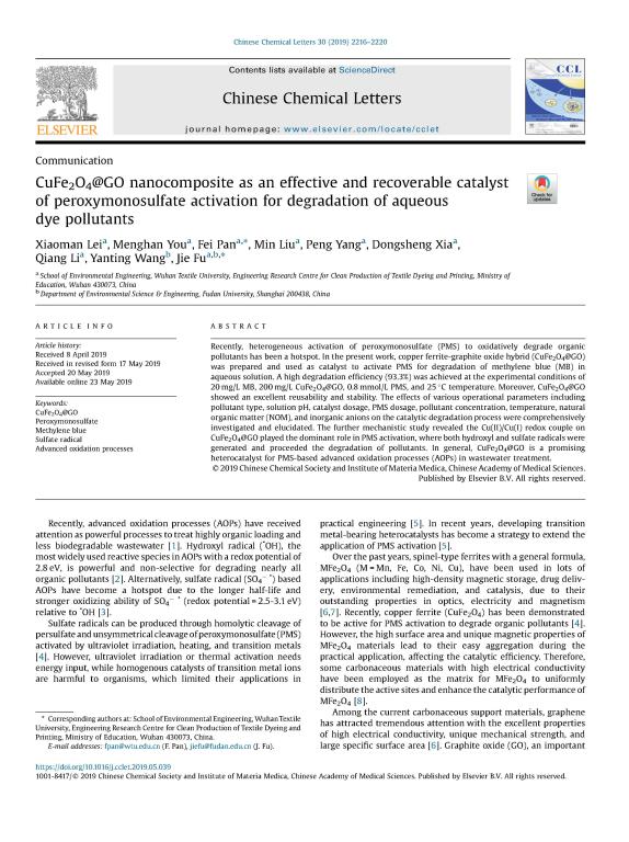 该研究采用一步式溶胶-凝胶燃烧法成功制备出具有磁性的复合材料CuFe2O4@GO,亚甲基蓝(MB)作为降解污染物;研究结果表明:在CuFe2O4@GO + PMS体系中,加入氧化剂PMS反应30min后,MB的去除率为93.4%。该材料具有磁性便于回收利用,经过5次循环重复实验MB的去除率为81.1%,且离子溶出较少。自由基淬灭实验和EPR测试表明CuFe2O4@GO +PMS降解MB体系中的活性自由基为SO4·-和·OH,且SO4·-起到主要作用;从CuFe2O4@GO反应前后的XPS测试结果可以看出,CuFe2O4@GO中的铁离子在反应前后的价态未发生改变,而铜离子在反应过程中存在价态的变化,即Cu2+-Cu3+-Cu+之间的氧化还原反应,这也是该体系PMS被活化的主要机制。该论文以武汉纺织大学环境工程学院为第一完成单位,雷晓曼同学为第一作者,潘飞老师为通讯作者。