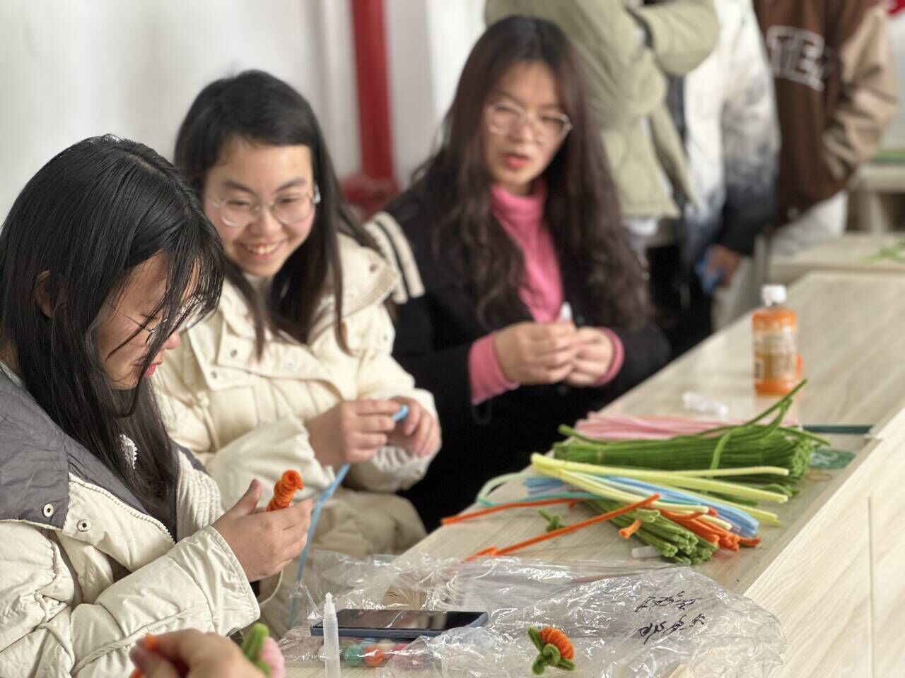 每个岗位的“她”都值得被看见,三尺讲台上的女教师、坚守到傍晚的宿管阿姨、维护校园卫生的保洁阿姨等等,都是在平凡岗位闪闪发光的女性。经过一下午的紧张制作,同学们扭出了30余种各式各样的花朵送给各岗位的女性们。“哇同学们真是心灵手巧,谢谢同学们!”10栋宿管阿姨开心的说道。“收到同学们亲手做的鲜花,我觉得非常温暖,也希望我的小女神们能学业有成,事事如意”施银桃老师分享到。