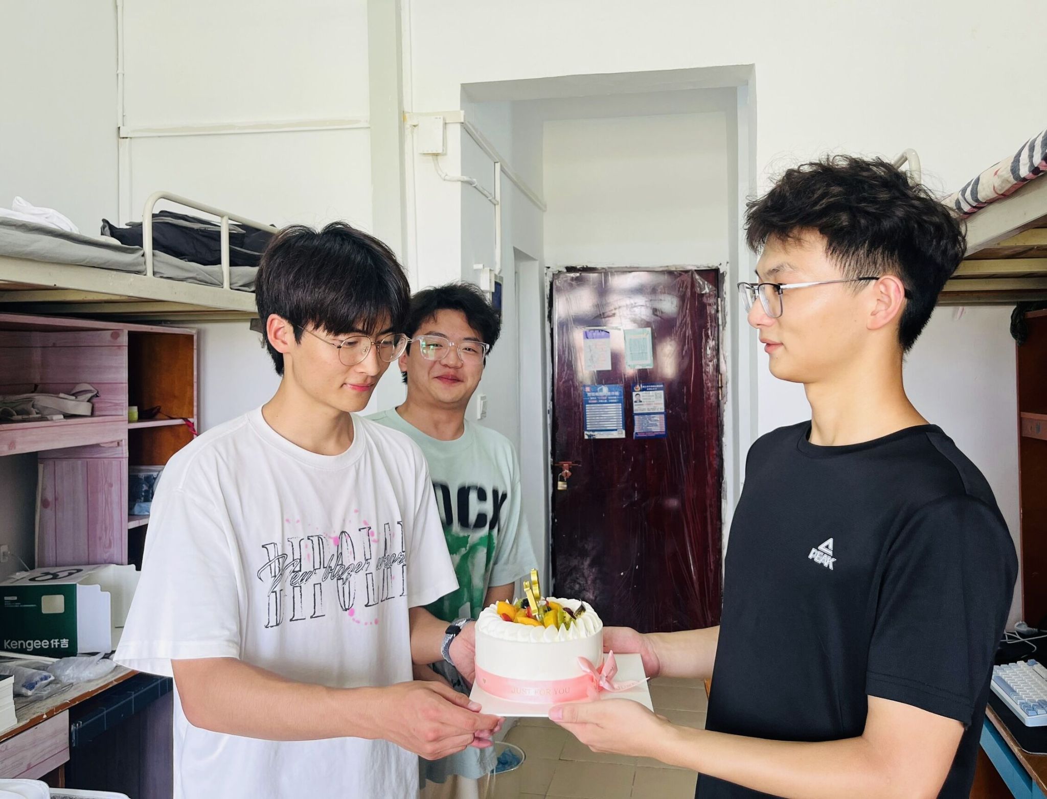 新生中,有两位报到的新生是9月8日当天生日。学院领导班子和同学们为建环12402班向承燃、资源12403班金华洋两位同学送上了最真挚的祝福。在欢乐的“生日快乐”歌声中,第一天大学生活的欣喜与生日祝福的惊喜让了两位同学忘却了长大后首次离家的伤感。