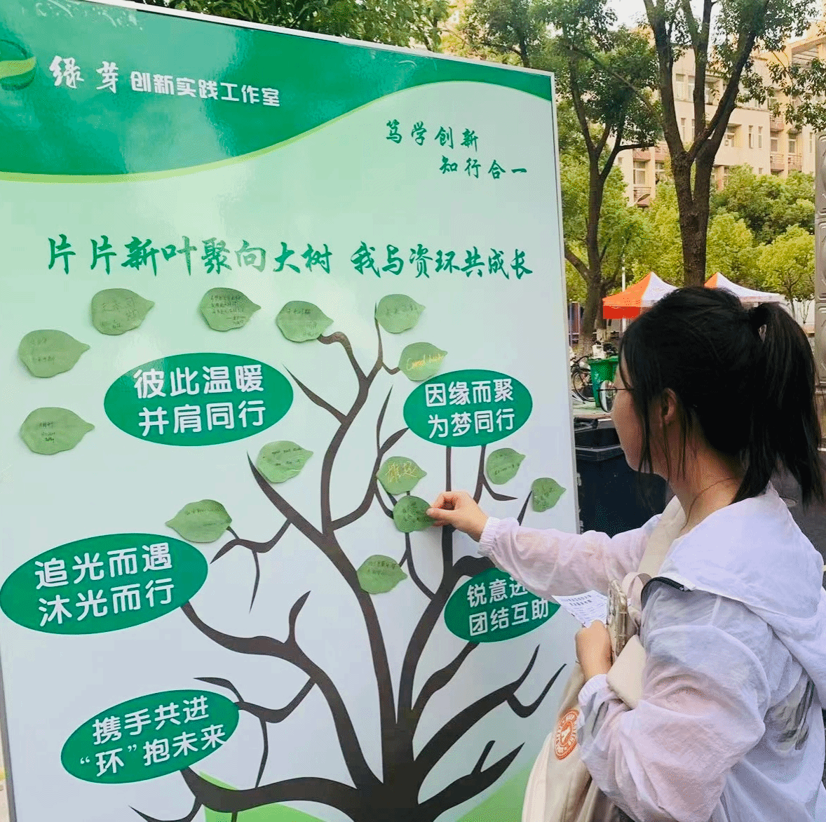 因缘而聚,为梦同行,“新叶心语”展示牌大树寓意着学院与同学们的关系,“片片新叶聚向大树我与资环共成长”,新生把写上自己大学的期待与梦想的“绿叶”粘在树干上,寓意新的绿叶加入“资环学院”这棵大树,枝繁叶茂,一起成长。在资环学院这棵大树上,我将努力汲取养分,让叶更绿,让花更艳,茁壮成长!”环境12404李若男将自己的那片绿叶贴在树干上,十分动容地说。