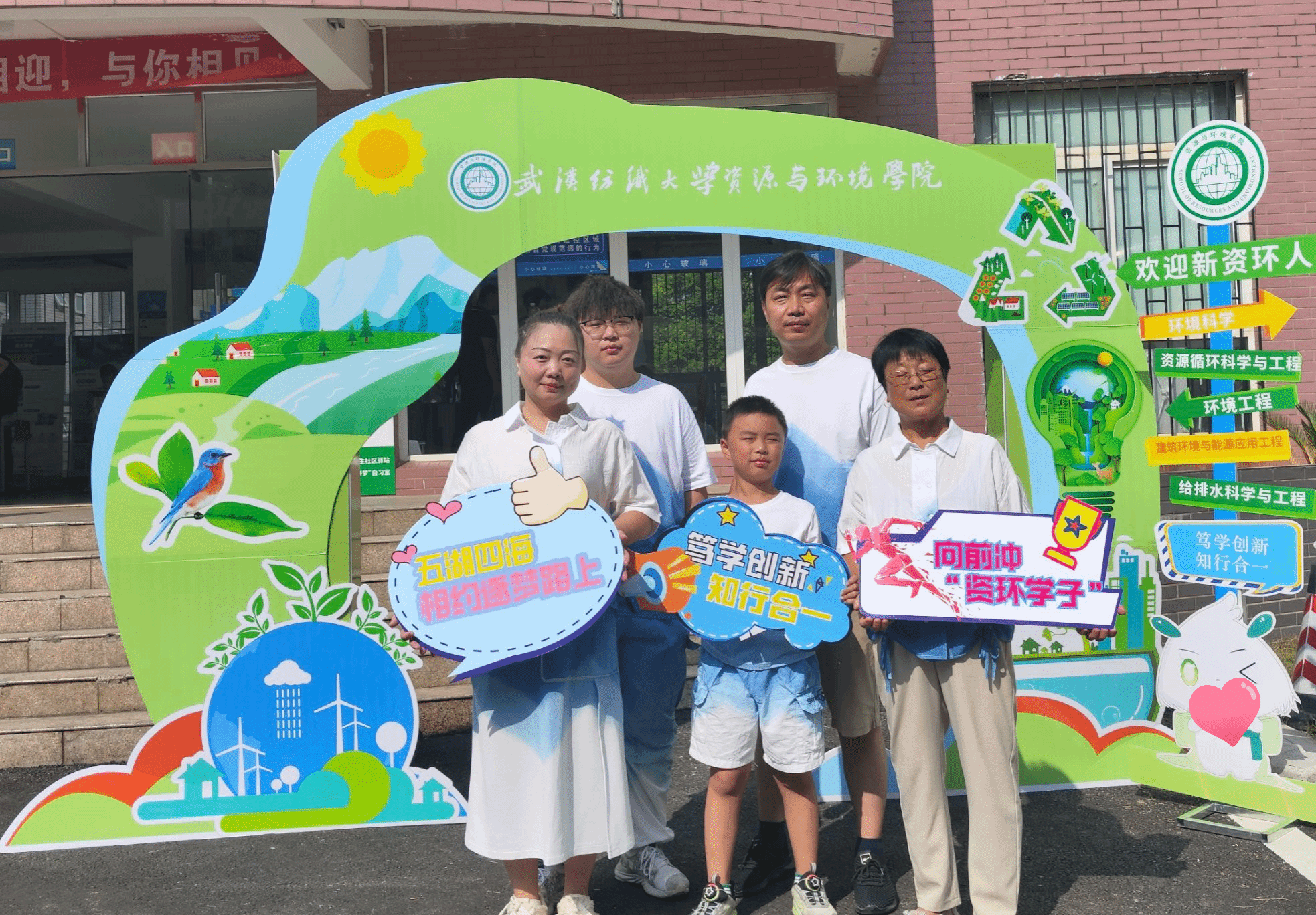 在资环学院“一站式”社区迎新的第一站,学院定制的特色打卡拱门,匠心独具地融合了山水林田湖草自然生态环境、资源循环、低碳节能环保、生物多样性、人工环境等专业元素,配以学院卡通萌宠绿小萌各专业和院训的生动解说让初来乍到的萌新们以互动体验式的方式加深了对学院的了解