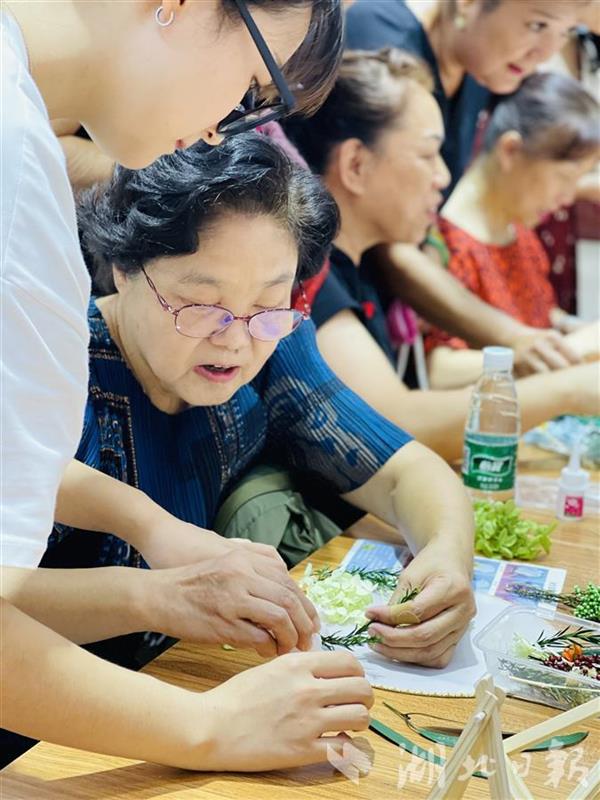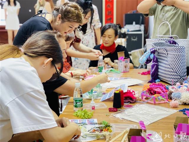 把干花和布片缝在扇面上,清新优雅的古风扇呈现在众人面前;把易拉罐剪开后凹出造型,中间穿上毛线,小巧的灯笼就做好了;把色彩丰富的废旧毛线缠在玻璃瓶上就是一个漂亮的花瓶……活动现场,在文艺轻骑服务队队员们指导下,“夕阳红”时装队的阿姨们忙得不亦乐乎。