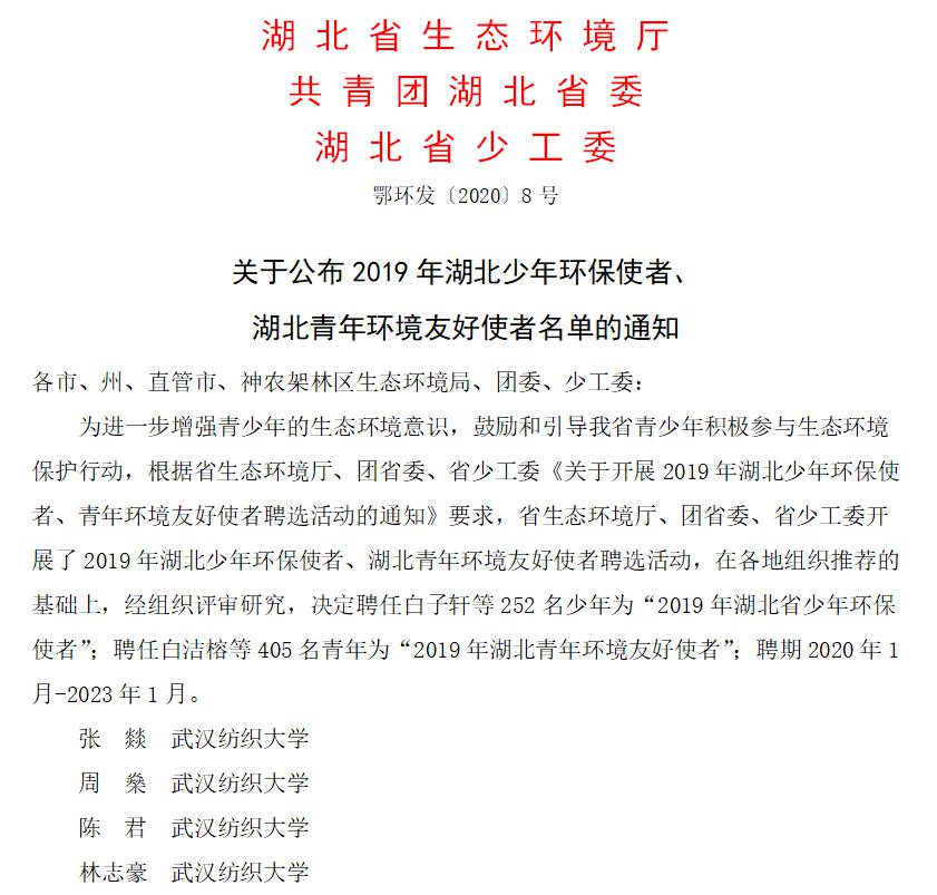 近日,湖北省生态环境厅公布了2019年湖北青年环境友好使者名单,绿色环保协会的张燚、周燊、陈君、林志豪4位同学顺利入选,聘期为2020年1月-2023年1月