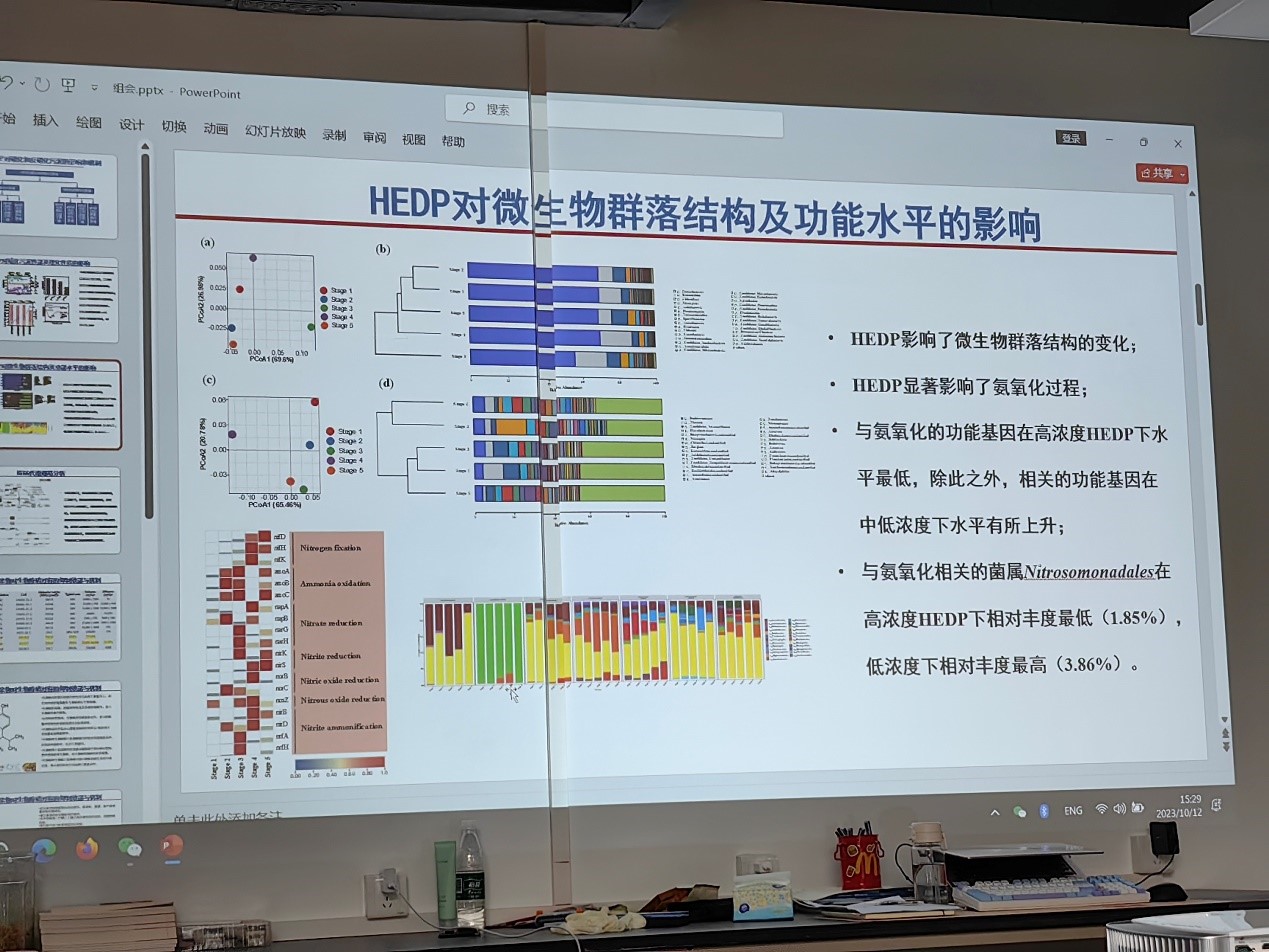 罗钧同学汇报了羟基乙叉二膦酸盐(HEDP)对硝化和反硝化过程的影响及其作用机理,阐述了HEDP的结构性质及可能对生物脱氮造成的影响。结果表明,HEDP会抑制氨氧化菌以及氨氧化功能基因,从而导致氨氮去除率下降。
