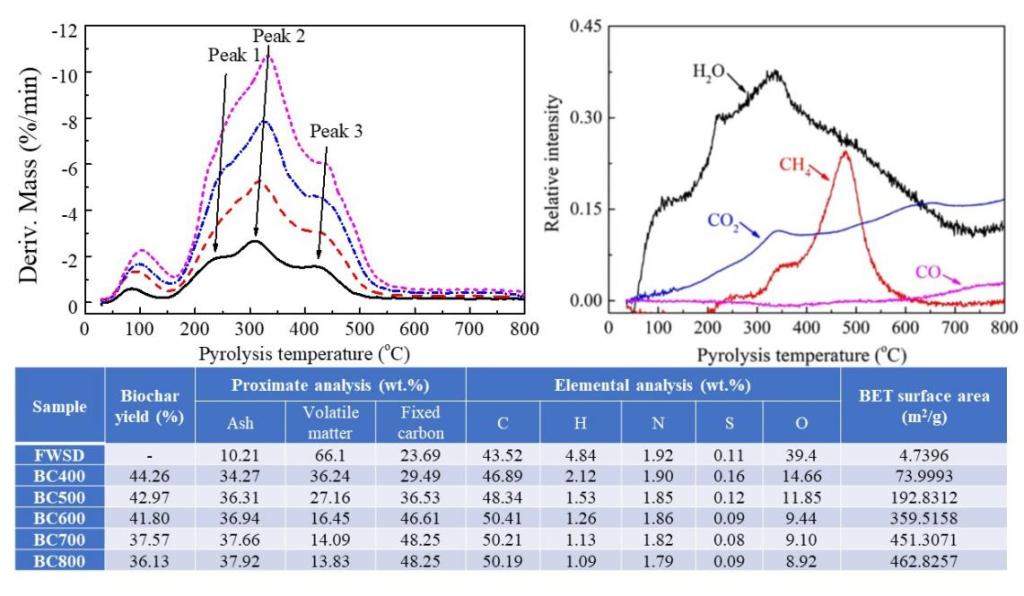 在领域TOP期刊Bioresource Technology (IF=9.642,T2)上发表了题为Preparation of biochar from food waste digestate: Pyrolysis behavior and product properties的论文,该论文第一作者为刘静欣博士,通讯作者为李进平教授,武汉纺织大学为唯一完成单位。该文章对餐厨垃圾沼渣的物化性质进行了充分详尽的研究,采用Starink非等温反应模型分析了热解过程动力学,TG-FTIR-MS检测表明H2O、CO2、CO、NO、NO2、烃类等是该沼渣热解过程中释放的主要物质,对所得生物炭材料的多维度的分析表征显示,该材料具有丰富的孔道结构和表面官能团,水溶性较低,材料特性受热解温度影响很大,此外,该材料继承了餐厨垃圾重金属含量低、Ca/N/P含量高的特点。本项研究提供了大量的基础数据,有助于提升餐厨垃圾厌氧发酵副产品再利用价值,促进沼气工程的推广与发展。