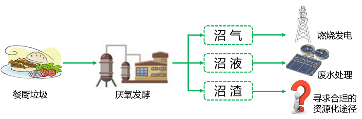 我国每年餐厨垃圾产生量已超过1亿吨,且仍呈上升趋势,为实现餐厨垃圾的减量化和资源化,多省市正积极新建和发展餐厨垃圾厌氧发酵处理厂。在现行沼气工程中,有机物转化效率仅为13%~65%,大量难降解有机成分和无机组分留存于沼渣中,成为制约沼气工程推广与发展的难点之一。目前,国内外对餐厨垃圾沼渣的处理仍主要停留于焚烧发电、堆肥、填埋等阶段,不但无法充分利用其中蕴含的丰富的有机质资源,而且其较高的盐分、氨氮含量也对空气、土壤和水体造成了威胁。