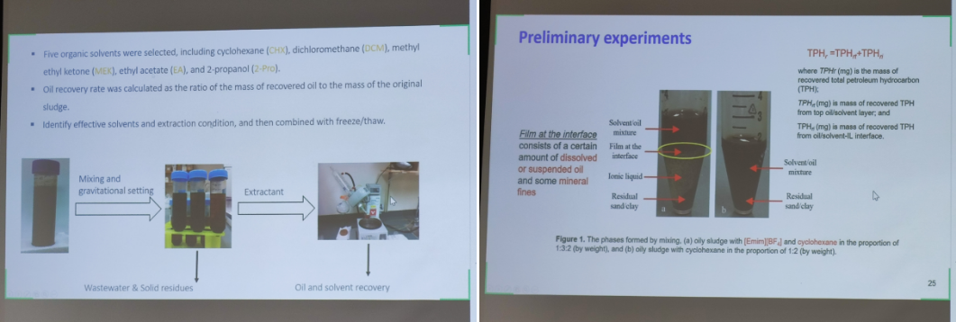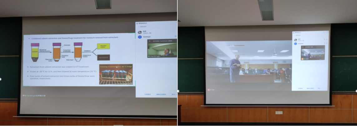 李建兵教授作了题为“value added utilization of oily sludge waste”的主旨学术报告。报告紧贴国际研究前沿,首先对当今油泥处理处置手段的优缺点、发展现状、使用场景、成本等方面作了详细的综述报告,其综述成果发表在环境领域高水平期刊Journal of Hazardous Materials中。李教授强调,由于油泥的多样性,很难用单一的、固定的手段对油泥进行油回收和处理,应认识到每一种处理手段的优缺点和局限性,从而进行精准选择。接着李教授具体讲解了溶剂提取法、离子液体+溶剂法、冻融法、热解法等方法,展示了其团队在这几个方向所做的工作和取得的成果。溶剂提取法是一种传统的油提取的方式,采用相似相溶的原理用萃取溶剂对油泥中油进行溶解,达到油水分离,为了提高萃取效率,其团队采用离子液体+溶剂的方法进行改进,将离子液体与溶剂以一定比例混合后进行萃取探究,离子液体的加入大幅度提高了萃取效率,并详细介绍了操作过程中离子液体的处理方式,其相应成果发表在了期刊Energy & fuel上;冻融法是将油泥置于较低温度下进行冷冻,使油泥中分散的油品集中成一体,再通过升高温度融溶,从而达到油水分离的目的,利用加拿大室外气温较低的特点,李教授团队在该方向上做了深入的研究和工程实践应用工作;而在油泥热解方向,用油泥与木屑混合协同热解,通过调控热解条件,混合比例,获得了产量更多热值更高的油产品,并实现了对油泥中重金属进行稳定化处理的效果,热解固体产物用于污染废水中重金属铅和镉的吸附去除,对应的成果发表在环境领域TOP期刊Journal of Hazardous Materials和Chemical Engineering Journal上。李教授的讲解深入浅出,详尽易懂,现场师生互动热烈、受益匪浅。