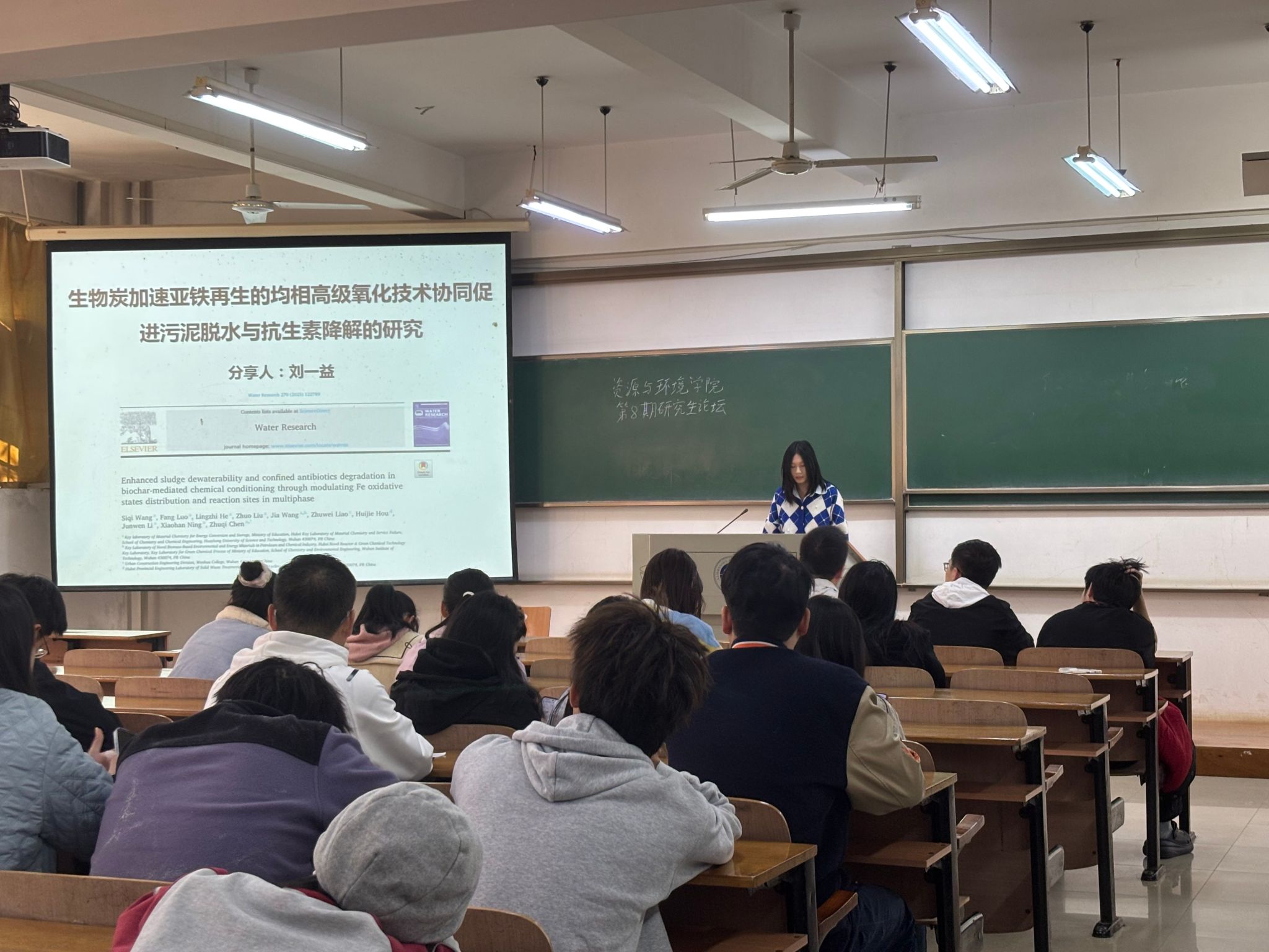 刘一益同学探讨了“生物炭加速亚铁再生的均相高级氧化技术协同促进污泥脱水与抗生素讲解的研究"展开,提出并验证了一种基于生物炭介导的化学调理策略,用于同步提升污泥脱水性能与抗生素降解效率。本研究揭示了生物炭通过调控Fe价态分布与多相反点位,实现污泥脱水与抗生素降解的双重增强,为废水处理厂中污泥资源化与抗生素污染控制提供了新思路。