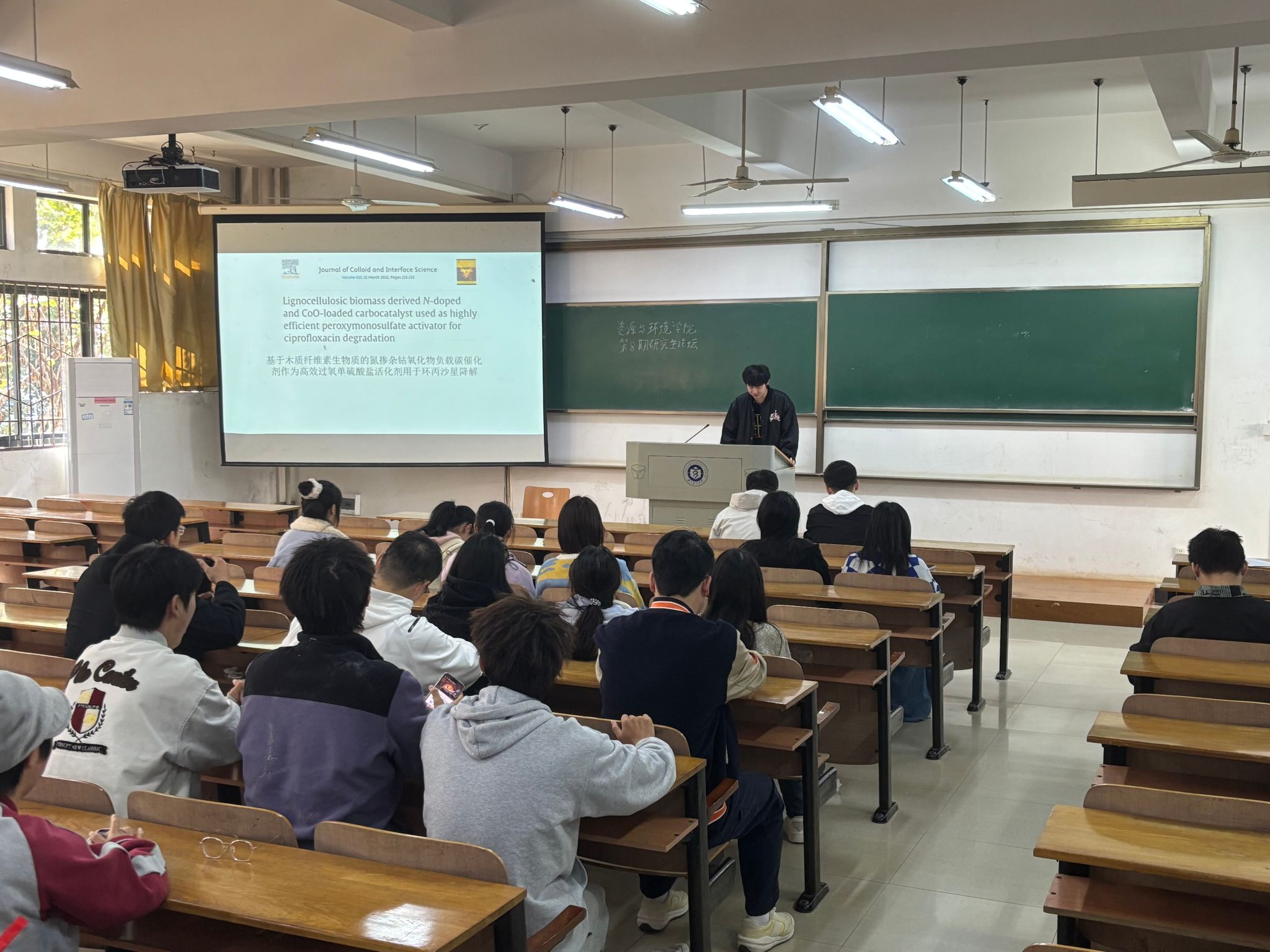 陈吉骜同学探讨了“基于木质纤维素生物质的氮掺杂钴氧化物负载碳催化剂作为高效过氧单硫酸盐活化剂用于环丙沙星降解这篇论文。讲解了本实验通过浸渍碳化的简单合成工艺合成了n掺杂和co包埋的碳催化剂,利用电子在CoO-N /BC有序碳网络上的定向流动,目标污染物可以通过自由基和非自由基途径逐步分解