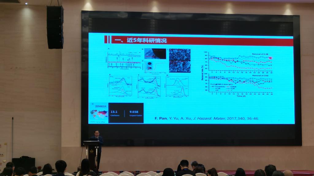 4月18日上午,潘飞教授在“工业水处理”分会场做了题为“物化-生物联合深度处理印染废水效能及其机理研究”的学术报告,主要分享了近年来在化学生物耦合强化废水处理技术方面的研究成果。报告受到了在场学者的一致好评,潘飞教授还针对与会者的提问进行了细致的回答,并期待与其它机构加强学术合作。