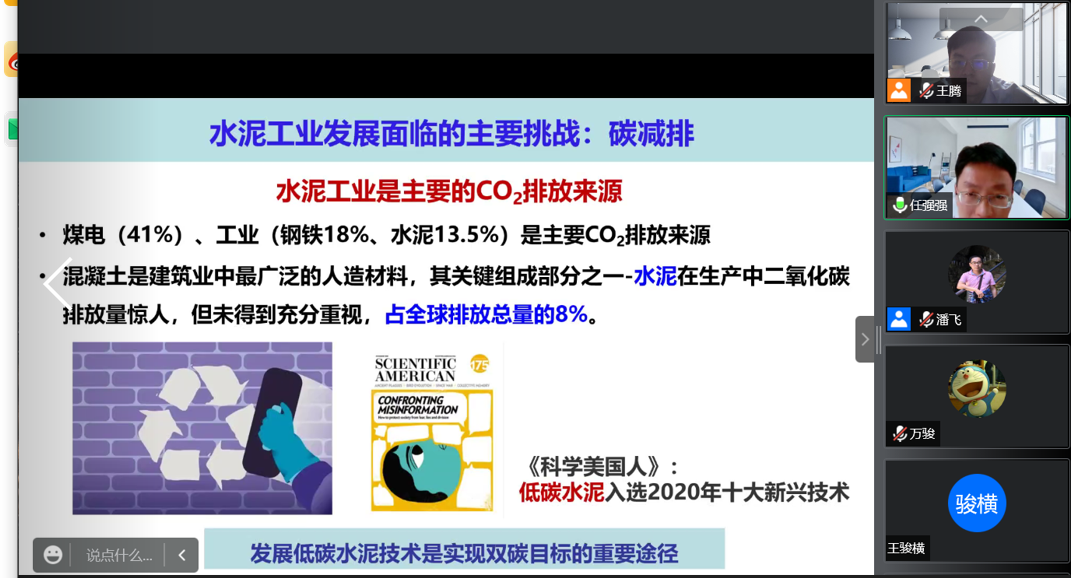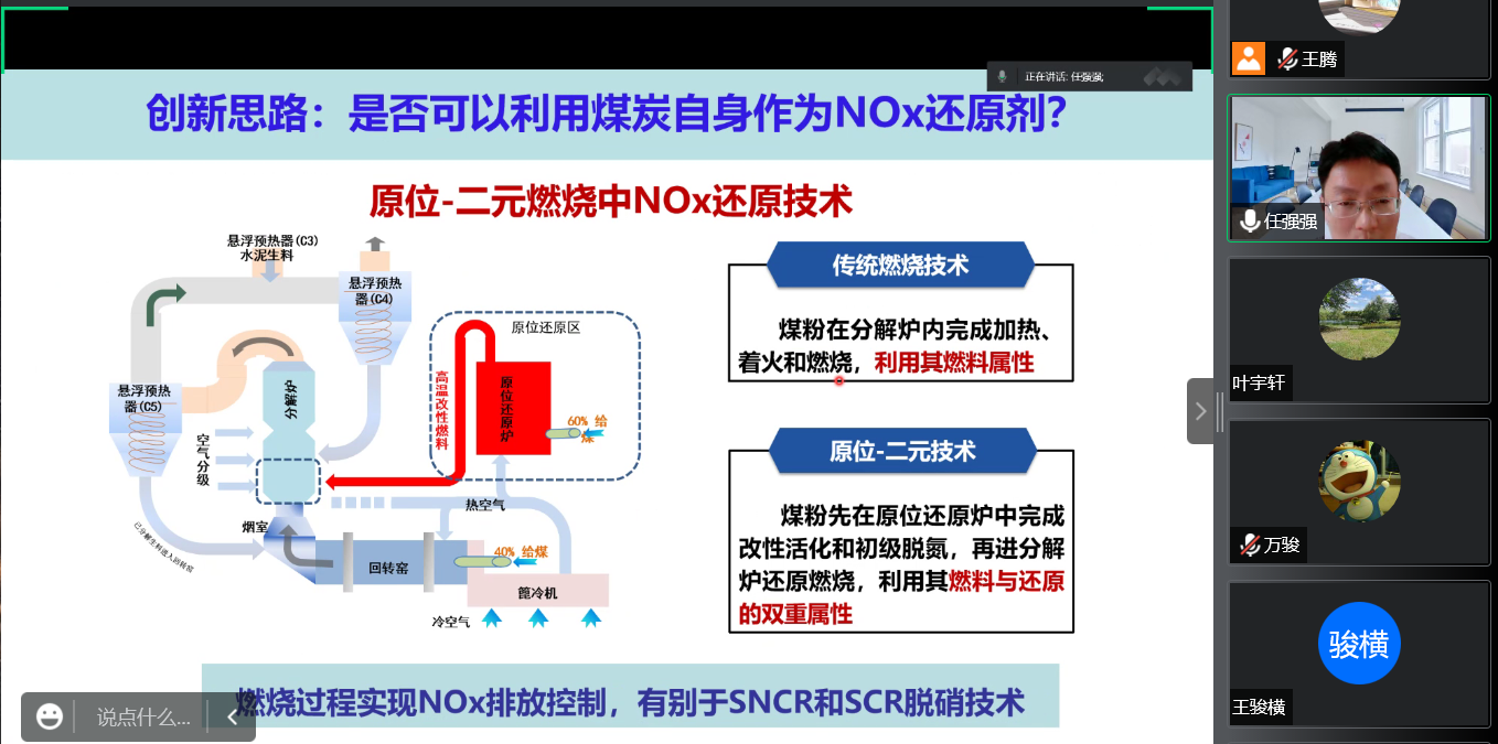 报告中,任强强研究员指出目前煤炭清洁高效利用已成为我国重大战略,作为碳排放的主要行业—水泥工业,其低碳化清洁化改革迫在眉睫。为解决水泥行业高NOx排放问题,任强强研究员团队创新性地提出原位-二元技术,利用煤炭自身的还原性,高效降低NOx的排放,实现2500吨/日水泥窑炉超低排放。此外,任强强研究员从“碳达峰,碳中和”的角度出发,强调了水泥行业低碳化,而非低煤化的前进方向。创新提出水泥熟料低碳烧成流程工艺,对水泥熟料生产工艺进行了变革性流程再造。