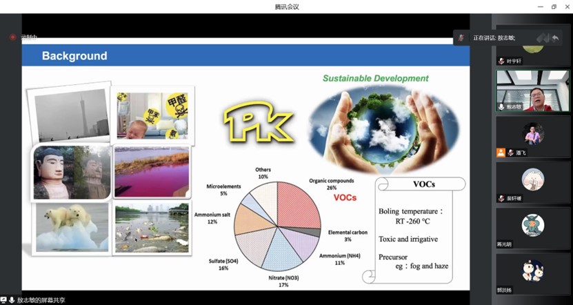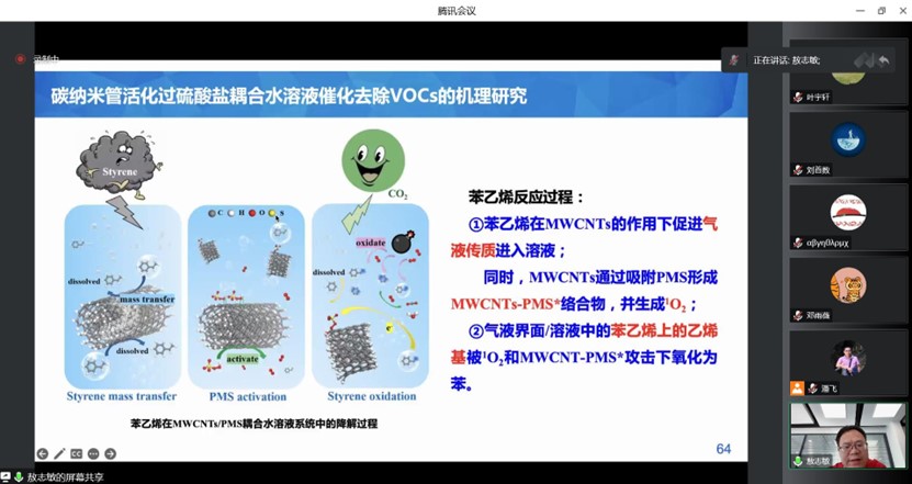 敖志敏教授从环境中的污染物特性入手,分析了过硫酸盐高级氧化技术在水体及大气污染物处理中的关键应用;建立了评价过硫酸盐活化过程中的自由基和非自由基产生的标准;通过一系列分析表征手段,识别碳基材料活化过硫酸盐的活性位点;基于以上成果,发展了以二硫化钼(MoS2)介导的新型光、热及压电催化过程,结合实验结果和密度泛函理论计算,揭示了MoS2活化过硫酸盐降解污染物的主要机理;同时,开展了碳纳米管活化过硫酸耦合水溶液催化去除挥发性有机物(VOCs的研究,发现材料表面的碳氧双键形成的氧化性络合物和单线态氧主要用于去除VOCs,去除效果和矿化率主要与VOCs自身的性质有关。报告结束后,参会师生踊跃提问,敖志敏教授对这些问题进行了细致解答。
