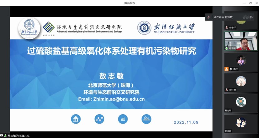 11月9日下午,环境工程学院在线上举办第257期阳光论坛。本次论坛邀请了北京师范大学敖志敏教授作了题为“过硫酸盐基高级氧化体系处理有机污染物研究”的报告。此次论坛由环境工程学院院长潘飞教授主持,学院教师和研究生参与了此次论坛。