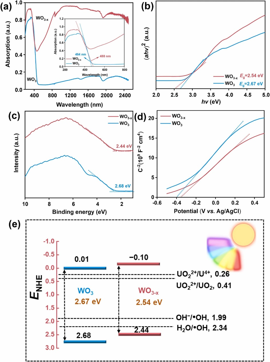 在U(VI)去除效果评价中,发现WO3-x展现出快速的U(VI)吸附动力学及极高的平衡吸附量(qe = 287.1 mg/g),吸附量是WO3的14倍 (图4a)。图4b进一步表明了,在模拟太阳光辐照4 h后,WO3-x可去除95.1%的U(VI),且79.9%的U(VI)被有效还原为U(IV)。相比之下,WO3对U(VI)的光催化还原率仅为9.6%。图4c表明了所研发的材料在广泛的pH范围内对U(VI)皆有好的去除效果。且图4d表明在多种离子共存情况下,WO3-x对U(VI)的去除率仍然很高(全部> 90%),说明WO3-x稳定性高且性能优异。