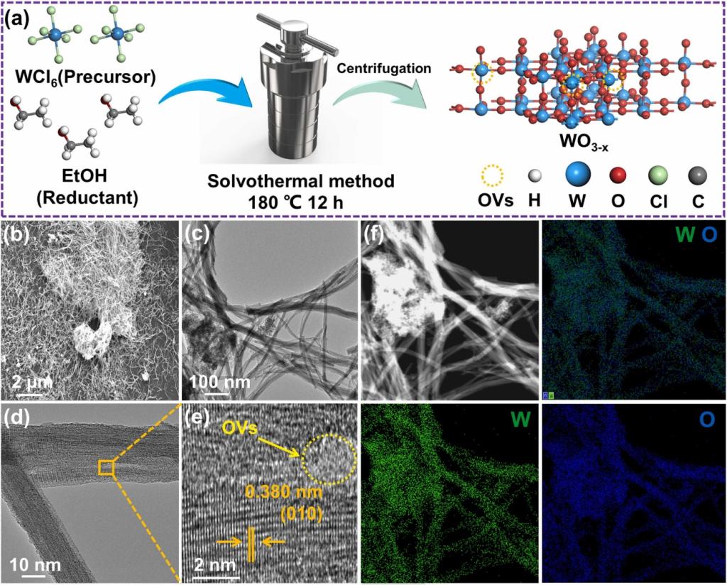 Fig. 1. (a) The schematic diagram on preparation process of WO3-x; (b) SEM image of WO3-x; (c) TEM image of WO3-x; (d) and (e) HRTEM images of WO3-x; (f) TEM-EDS elemental mapping of WO3-x.