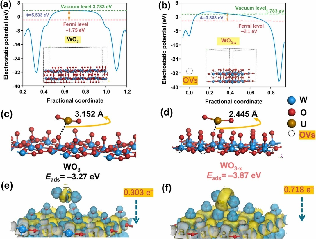 Fig. 6. The work function of (a) WO3 and (b) WO3-x; DFT calculations on adsorption of UO22+ onto materials: the adsorption energy of UO22+ onto (001) plane of (c) WO3 and (d) (010) WO3-x; EDD image for (001) plane of (e) WO3 and (f) (010) WO3-x after UO22+ adsorption (the isovalue is 0.05; yellow region: electrons depletion; cyan region: electrons accumulation).