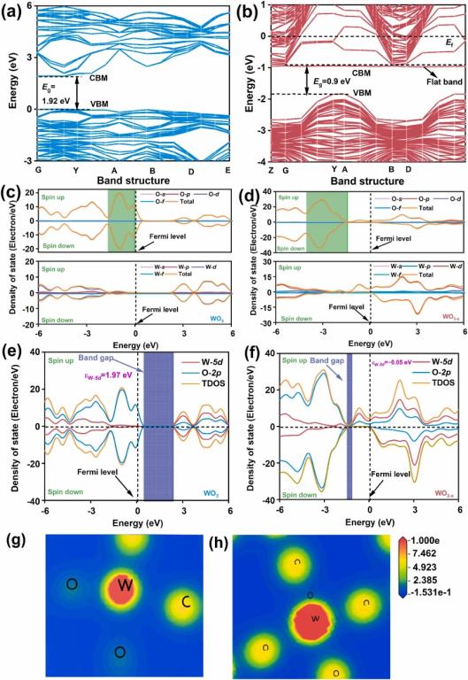 Fig. 3. The calculated band structures of (a) WO3 and (b) WO3-x; PDOS spectra of (c) WO3 and (d) WO3-x; (c) DOS spectra of (e) WO3 and (f) WO3-x; electron density of (g) WO3 and (h) WO3-x.