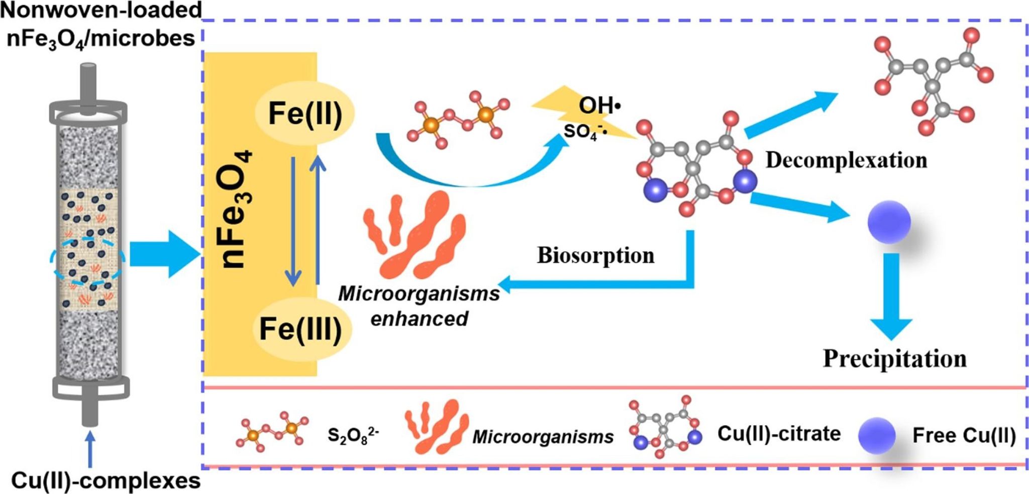近期,课题组在前期研究的基础上,以柠檬酸铜作为典型污染物,对单独的氧化体系、生物体系和耦合体系进行对比;考察了不同因素的影响;并结合连续流反应器对实际应用特性进行研究,揭示了微生物在纳米Fe3O4活化过硫酸盐破络过程中的强化机制,为重金属络合物的处理和过程设计提供了新的思路。研究成果以“Enhanced decomplexation of Cu(II) complexes and Cu removal by the nFe3O4/persulfate coupled microbial system: Synergistic effect, validation, and mechanism”为题,发表于知名学术期刊Separation and Purification Technology (中科院1区,2022年IF=8.6,论文链接:https://doi.org/10.1016/j.seppur.2023.125577)。论文第一作者为硕士生甘睿,通讯作者为叶宇轩博士和潘飞教授,硕士生王笠为共同作者。