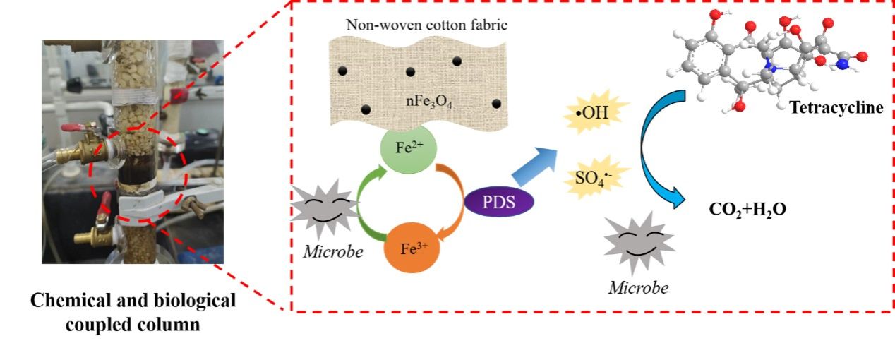 印染、电镀、制革等各种工业废水含有大量重金属,若不及时处理会对环境造成极大危害。常见的处理工艺如沉淀、吸附、离子交换等虽可有效去除游离重金属,但在实际废水中,游离重金属会与有机配体形成稳定的重金属络合物,抑制了传统工艺的去除效率。因此,开发高效、廉价的破络工艺来消除重金属络合物对环境的影响是亟待解决的问题。该课题组前期结合我校的纺织特色,以无纺棉布为载体,构建了纳米Fe3O4和活性污泥的复合体系,此次发表的研究成果进一步将该体系扩展到重金属络合物的去除。前期的科研成果已于2023年7月发表于环境领域学术期刊Journal of Water Process Engineering(中科院2区,2022年IF=7.0,论文链接:https://doi.org/10.1016/j.jwpe.2023.103718),我校为第一署名单位,该论文第一作者为硕士生王笠,通讯作者为叶宇轩博士和潘飞教授。