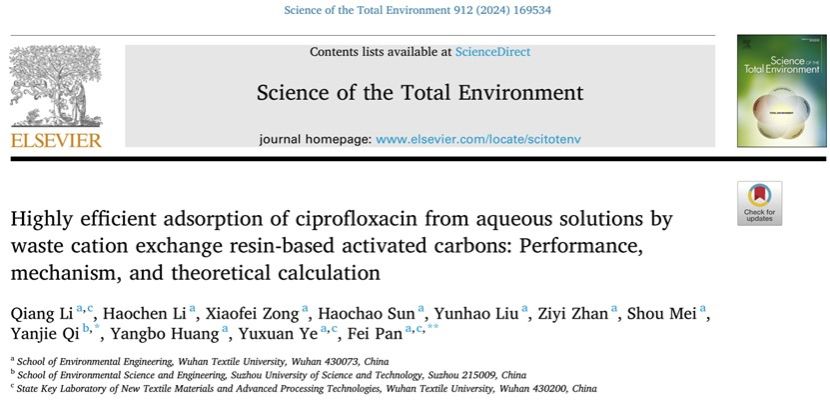 近日,武汉纺织大学潘飞教授团队在Science of The Total Environment上发表了题为“Highly efficient adsorption of ciprofloxacin from aqueous solutions by waste cation exchange resin-based activated carbons: Performance, mechanism, and theoretical calculation”的研究论文(DOI: 10.1016/j.scitotenv.2023.169534),探究了废弃阳离子交换树脂活性炭吸附剂对水溶液中环丙沙星的吸附性能及机制。该文以废阳离子交换树脂为原料,通过一步碳化法制备得到高效吸附环丙沙星(CIP)的活性炭吸附剂。利用扫描电子显微镜、X射线衍射、傅里叶变换红外光谱和X射线光电子能谱对碳化树脂的理化性质进行分析表征。探究碳化树脂对CIP的吸附去除效果、影响因素及吸附机理,并采用密度泛函理论(DFT)计算了吸附机理。本研究为废弃阳离子交换树脂的资源化利用提供了一种新的途径。该论文的第一作者为李强副教授,通讯作者为潘飞教授,武汉纺织大学为第一单位。