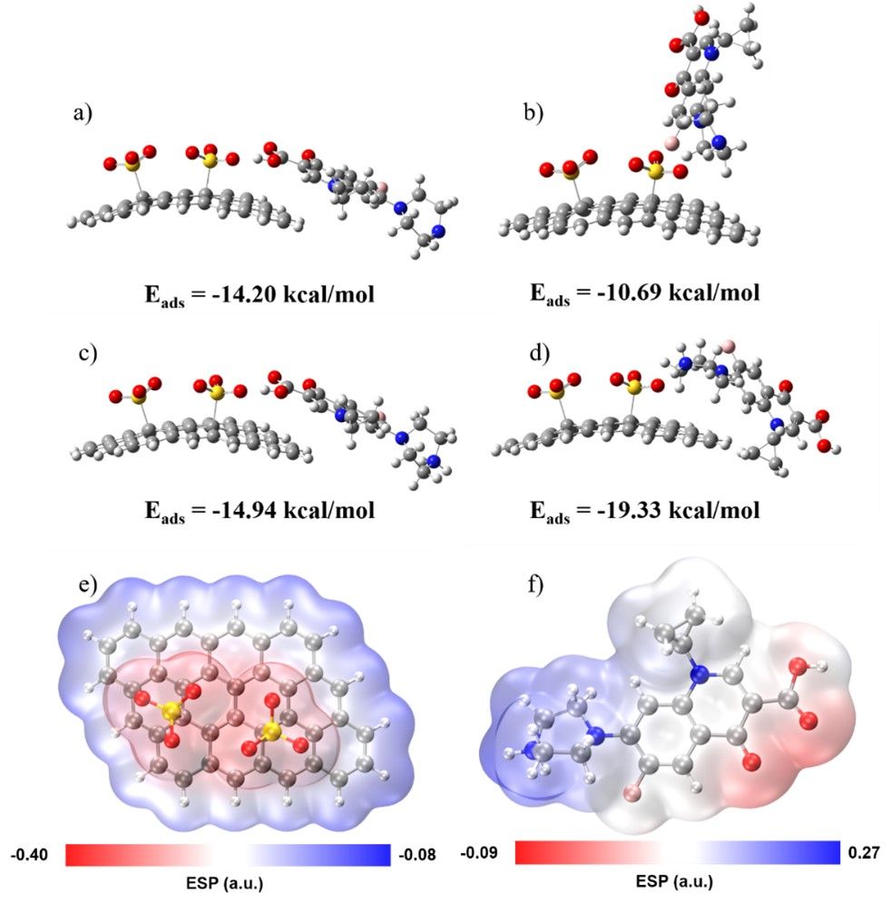Eads值表示吸附过程中的吸附剂与污染物的结合能力(图1a-d)。通过OH-O和NH-O的氢键作用,碳化树脂与CIP的相互结合能分别为-14.20和-10.69 kcal/mol。当CIP分子被质子化时,碳化树脂与质子化CIP分子之间的Eads分别为14.94 kcal/mol和-19.33 kcal/mol。碳化树脂与质子化CIP之间的Eads增强表明在吸附过程中发生了离子交换。图1e-f中碳化树脂和CIP的ESP分布进一步证实了这一过程。在磺酸基团附近,红色区域较多,表明具有较强的负电势(-0.4),而在质子化的CIP中,蓝色区域较多,表明具有较强的正电势(0.27)。因此,静电势分布特征为离子交换提供了充分的条件。理论计算得到的吸附作用过程与实验数据分析完全吻合。