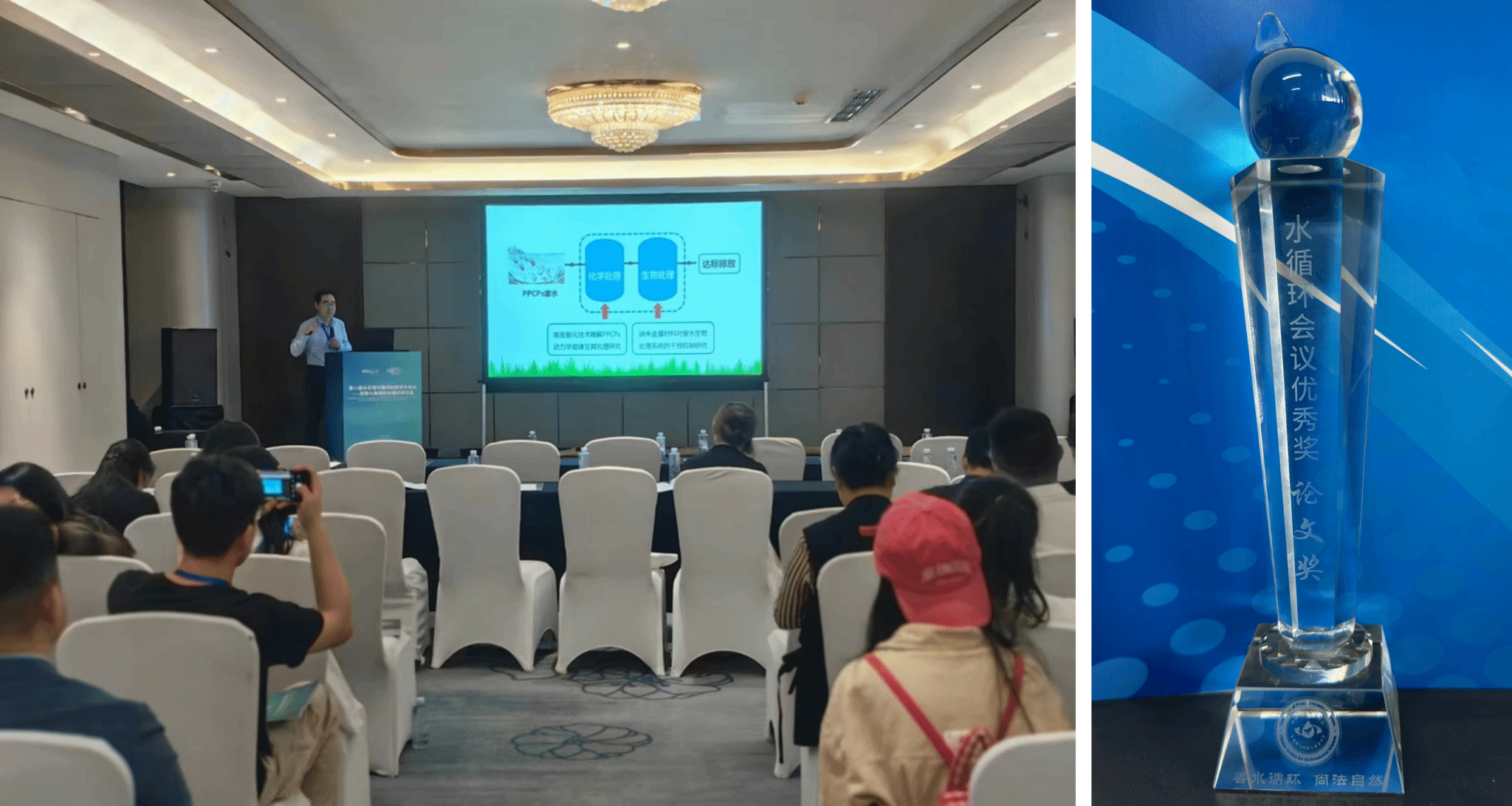 潘飞教授在“分会场十四-水处理材料与药剂”做了题为“纤维基衍生碳活化过硫酸盐降解四环素的反应机制研究”的学术报告,主要分享了近年来课题组在纤维基材料制备及在高级氧化处理废水方面的应用研究。报告受到了在场学者的一致好评,潘飞教授荣获了“水循环会议优秀奖(论文奖)”;他针对与会者的提问进行了细致的回答,并期待与其它机构加强学术合作。