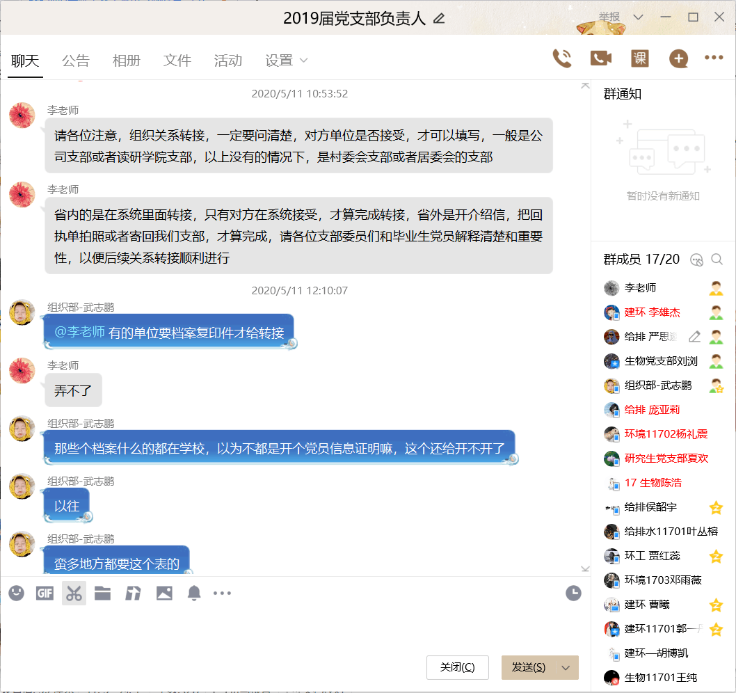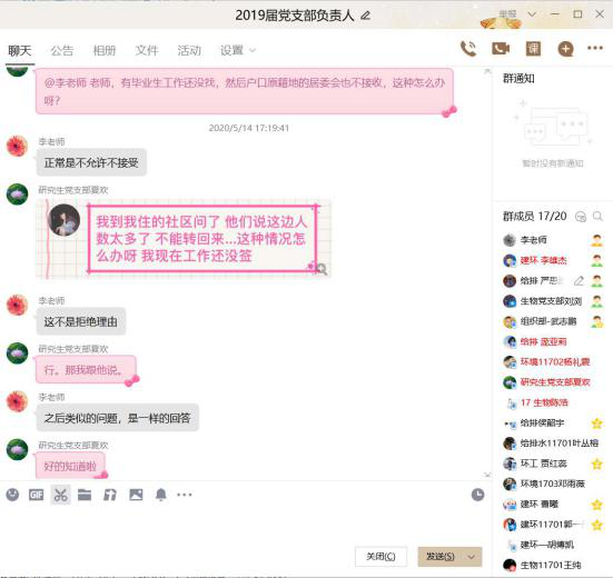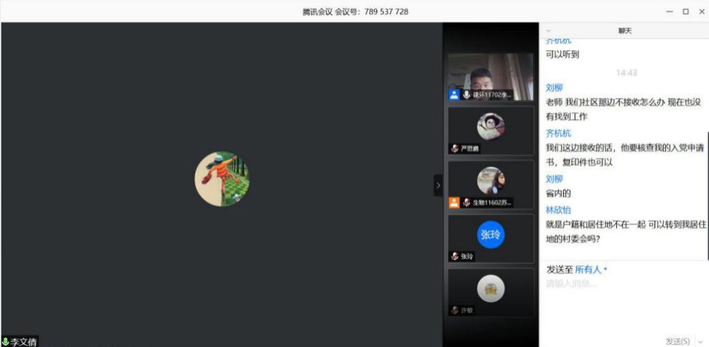 校组织部发放《关于切实做好2020届毕业生党员教育及组织关系转移等工作的通知》之初,李文倩老师便组织学生支部委员们自主学习毕业生党员关系转接流程及相关要求,对组织转移流程的基础要点进行强调,并线上实时解答问题,力求各学生支部负责人明确转接流程为毕业生组织关系转移工作打好基础
