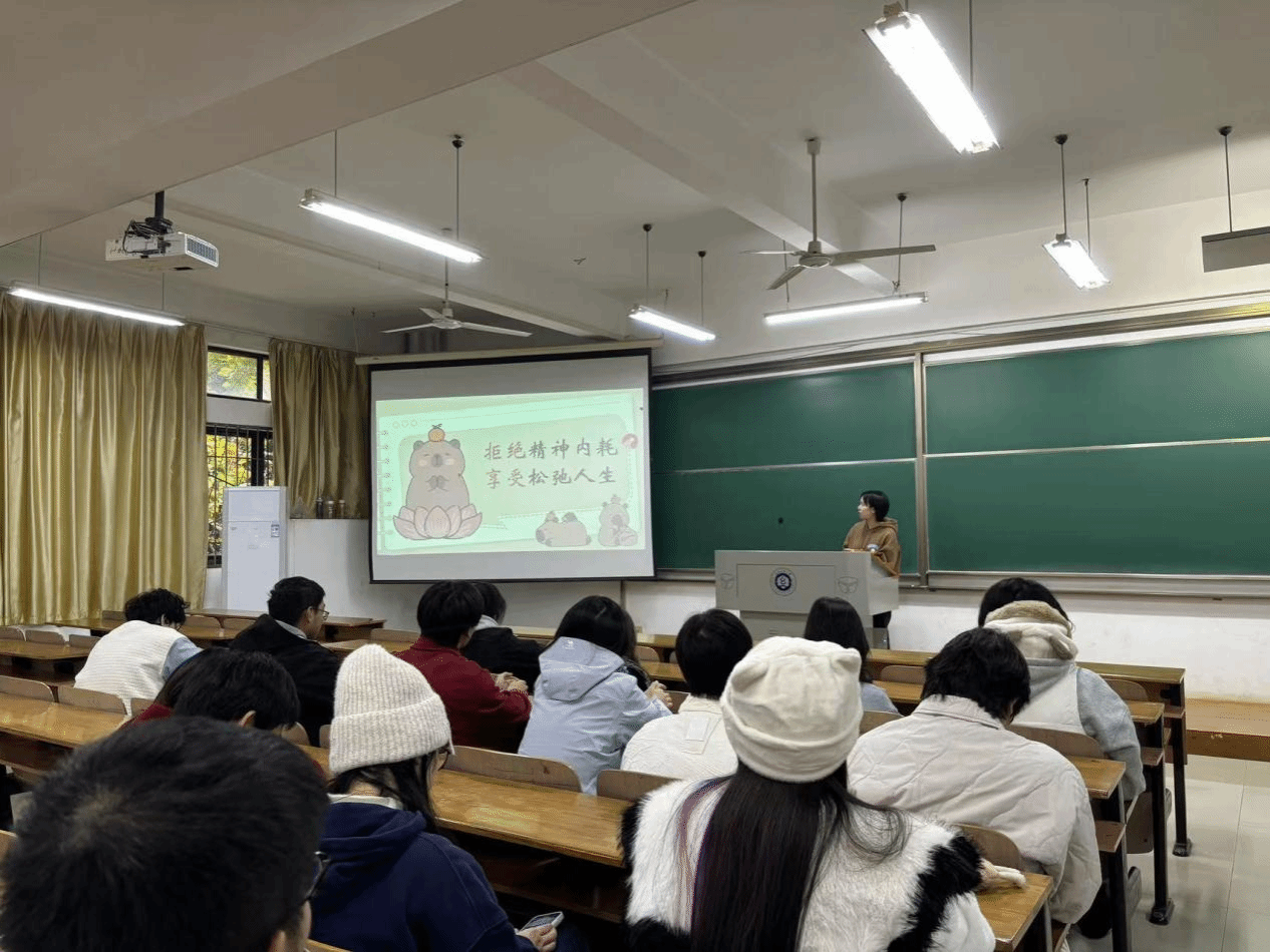 研究生黄丽娟以《拒绝精神内耗,享受松弛人生》为题,进行了心理微课分享。她说:“在面对焦虑时,我们应该专注当下,避免过度思考,制定合理计划,分步实现目标,学会放手,接受无法控制的事情,保持积极心态,看到事物的积极面,必要时寻求专业帮助。”