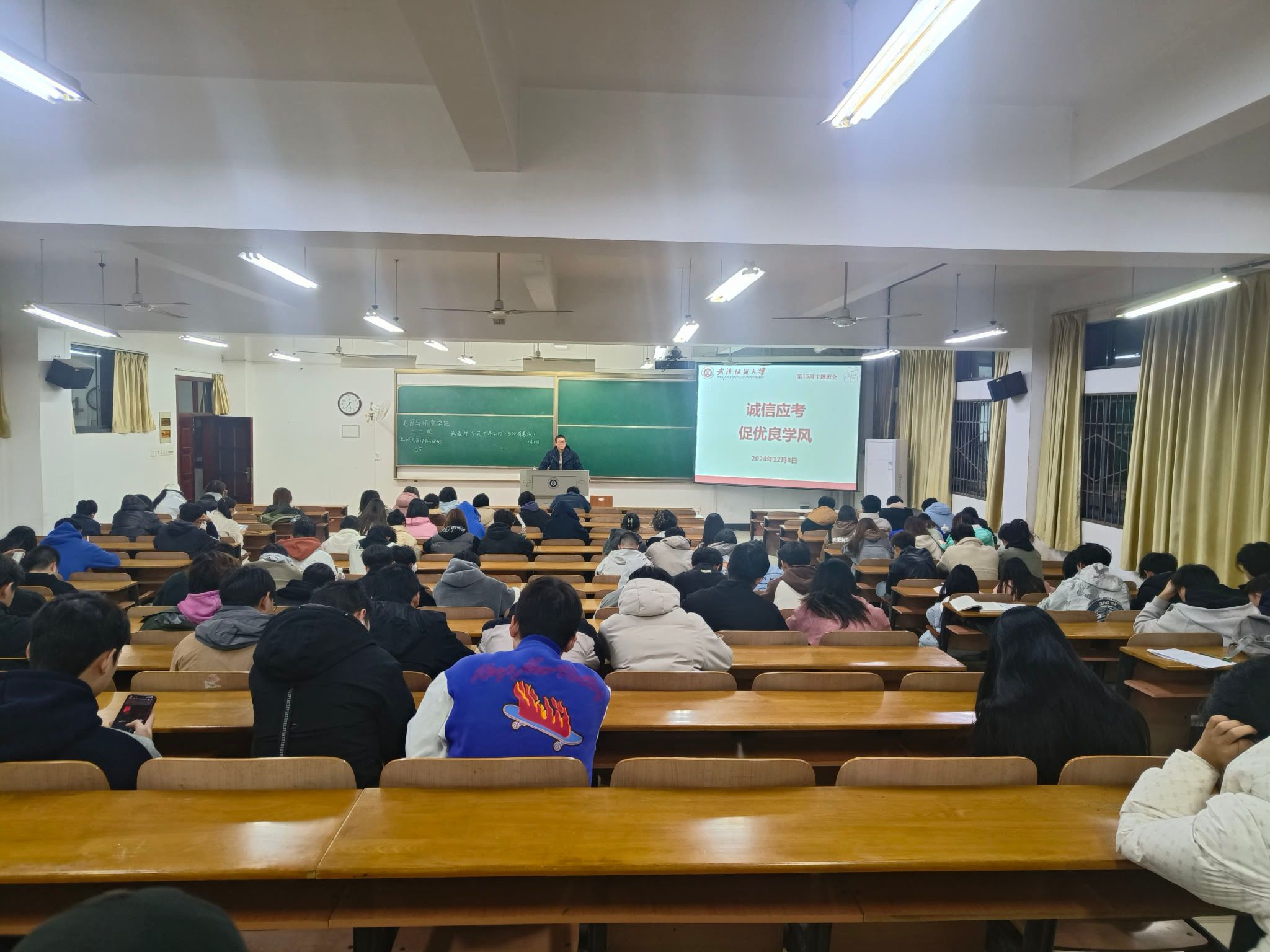 随后,老师们具体宣讲了诚信考试的重大意义与考试行为规范。诚信应考,既提升自身修养,培育学生诚信品质,又利于建设优良学风、校风,打造诚信校园。班会上,老师们用真实案例告诫学生诚信应考,杜绝作弊。并严肃宣读《武汉纺织大学学生考试违纪的处理方法》,让学生深知作弊后果,坚守诚信本质,自觉遵守考试纪律。