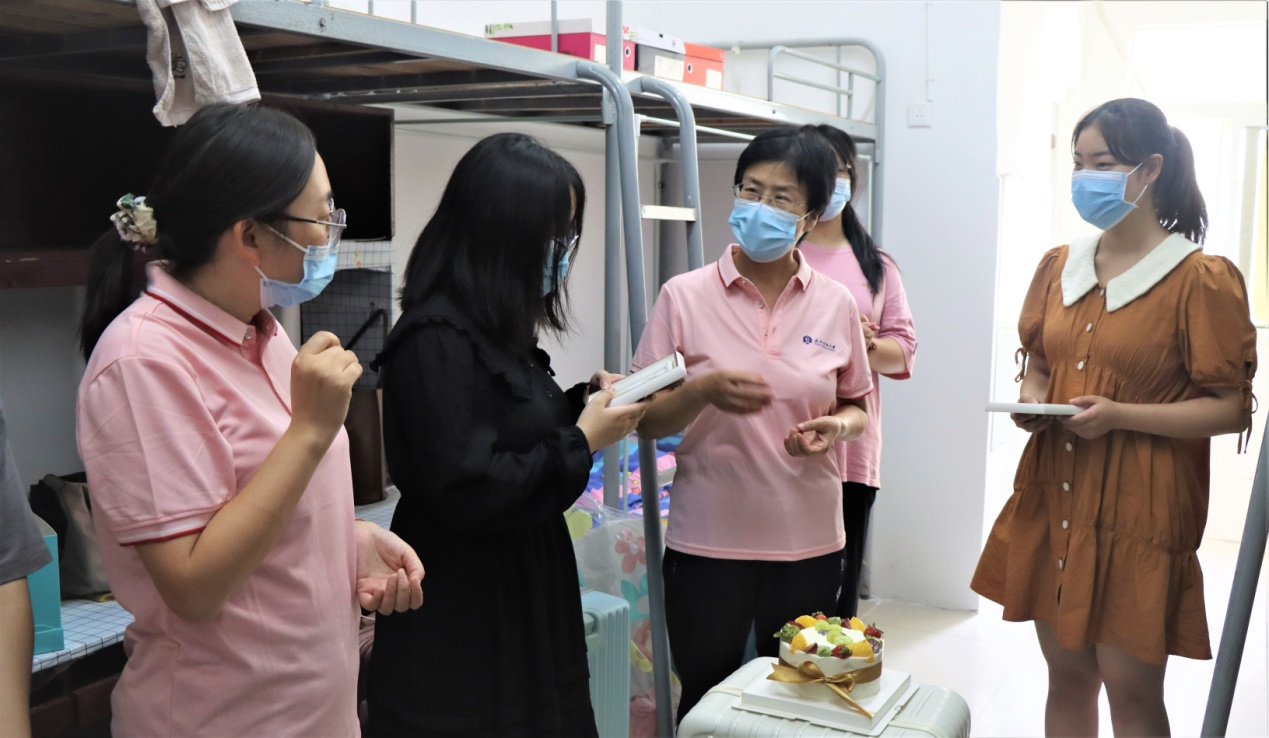 小小的宿舍,充满着大大的温暖。9月9日,学院党委书记谢晓萍、院党委副书记姚瑶、新生辅导员、班主任等走访新生宿舍,并为环境12202班田慧美、环境12006班鲁欣雨两位同学准备了一场温馨的生日会,送上绿色环保协会志愿者手作的树叶画,在欢乐的“生日快乐”歌声中,第一天大学生活的欣喜与生日祝福的惊喜让了两位同学忘却了刚刚离开父母的伤感。