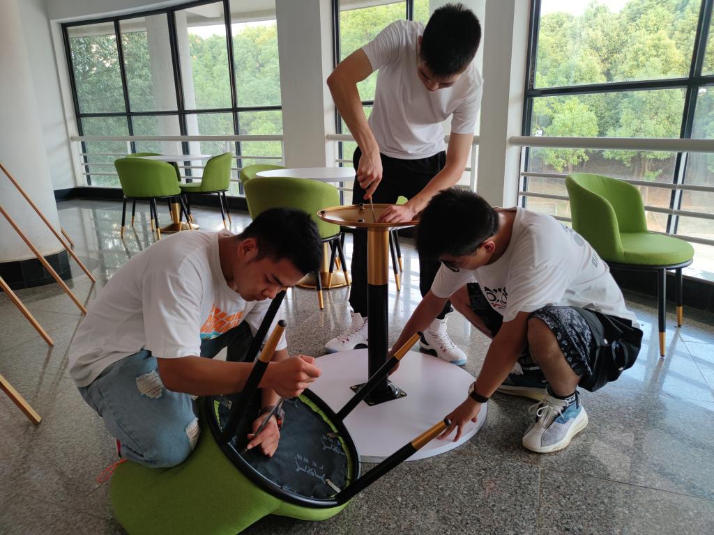 眼看太阳渐渐落山,豆大的汗珠直从马吉斌脸颊落下,来不及擦拭,他想趁天黑之前把桌椅都按装好。于是他想到了同窗好友朱滔、贾江伟,一个电话下来,不到十分钟,两人就赶到了现场。三人齐心协力、十分默契,边看安装视频边尝试安装,不到两小时就大功告成。“今日事,今日毕,这也是我们在部队养成的作风”,朱滔表示。