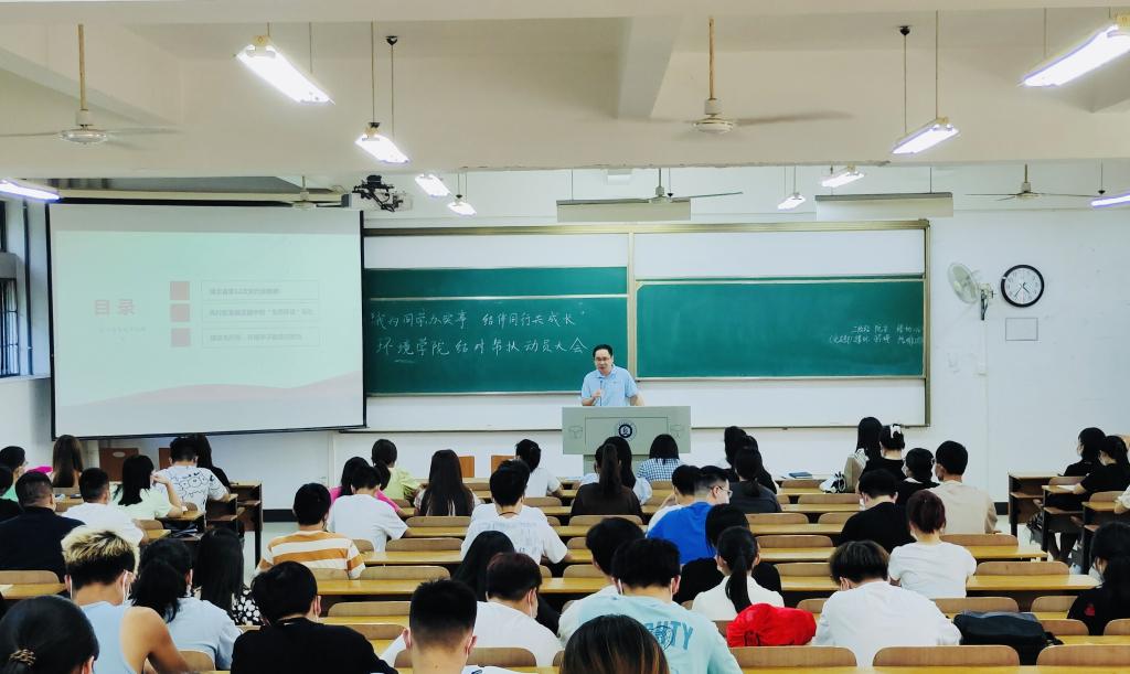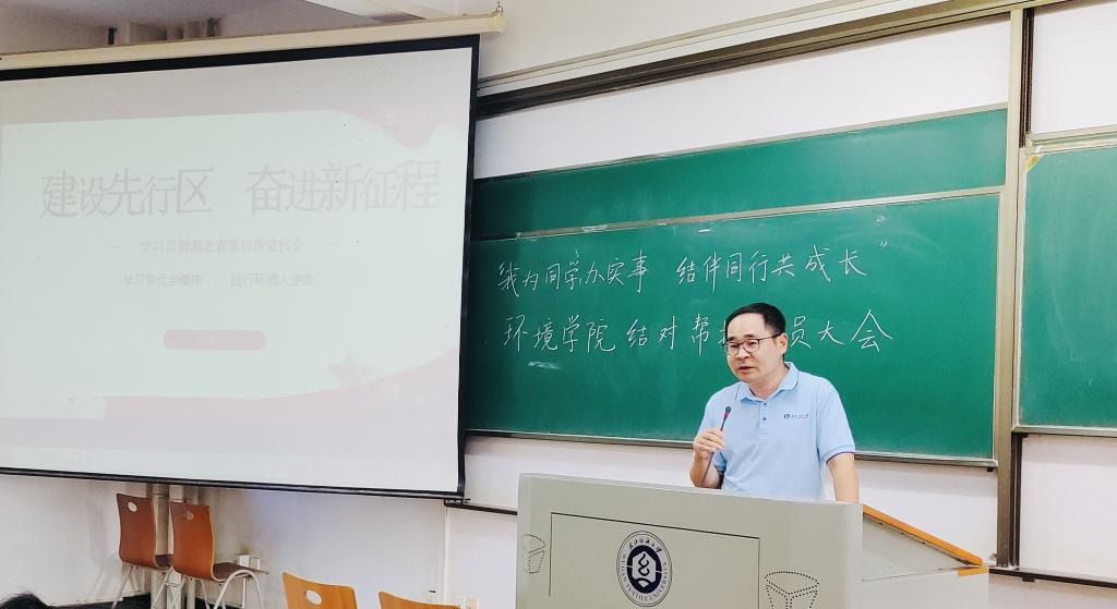 潘飞寄语全体学生党员,要深入学习党代会精神,践行环境人使命。一是学习习近平生态文明思想,以“党建红”引领“生态绿”;二是学好“环境”专业知识,做专业的“环境”人;三是投身“生态环保”实践,建设美丽中国。他还勉励同学们用脚步丈量祖国大地,用知识“点亮”江湖 ,助力武汉创建国家生态文明城市,在建设美丽中国的过程中展现出属于环境学子的责任与担当!