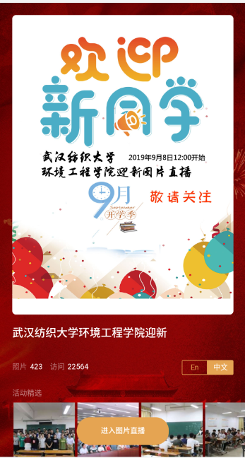 原来,该校环境学院在今年迎新中,考虑到部分新生家人可能由于工作、身体等原因,不能陪同一起来校报到,就开展了迎新图片的实时直播活动。学院早早将二维码在新生群和家长群分享,鼓励他们转发,无论是现场报到的新生、家长,还是远方的亲戚朋友,都能实时感受报名现场的热烈氛围,与远方的亲人一起分享幸福时刻,这也是环境学院首次采取图片直播的方式迎新,仅仅1天时间,浏览量就将近2.3万。
