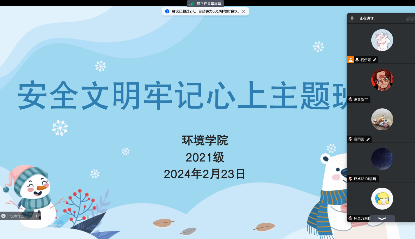 为切实做好春季开学工作,传达学校开学相关要求,了解学生返校安排和困难,确保同学们安全有序返校,开启美好新学期。2月23日,学院本科生、研究生分别开展了“安全文明牢记在心上”线上主题班会。