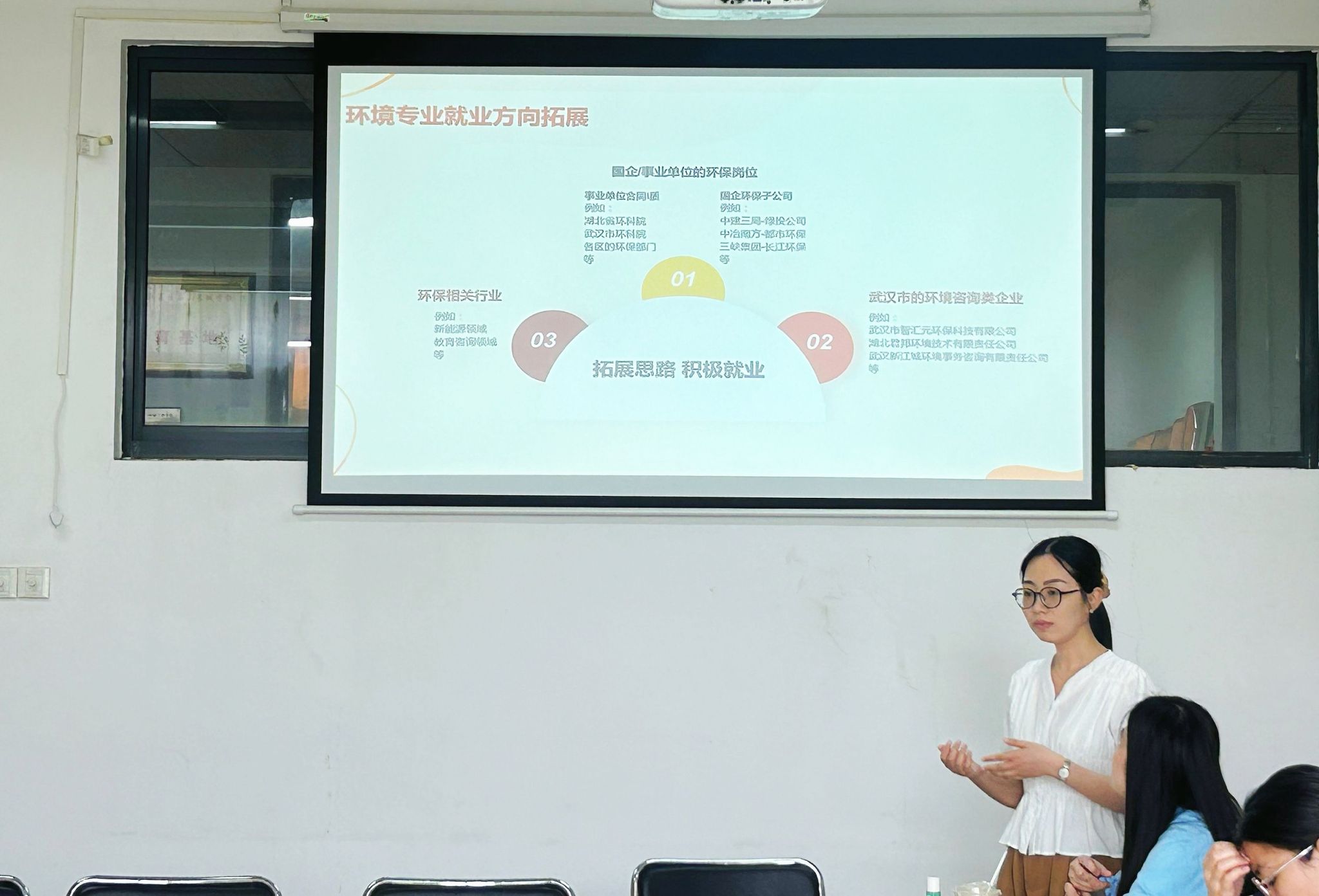 两位德育导师结合自身就业经历,围绕就业常见的心理困扰、如何进行调试和压力应对等内容展开讲座。叶宇轩鼓励学生们调整就业心态,了解目前就业形势,同时结合自身的兴趣、研究方向、特长等,正视就业困难,充分认识专业职业价值,树立正确的职业价值观。杨璐就环境专业就业方向进行了介绍,就环保相关行业、国企、事业单位的环保岗位、武汉市的环境咨询类企业的求职方式进行分析,为毕业生指明就业方向。