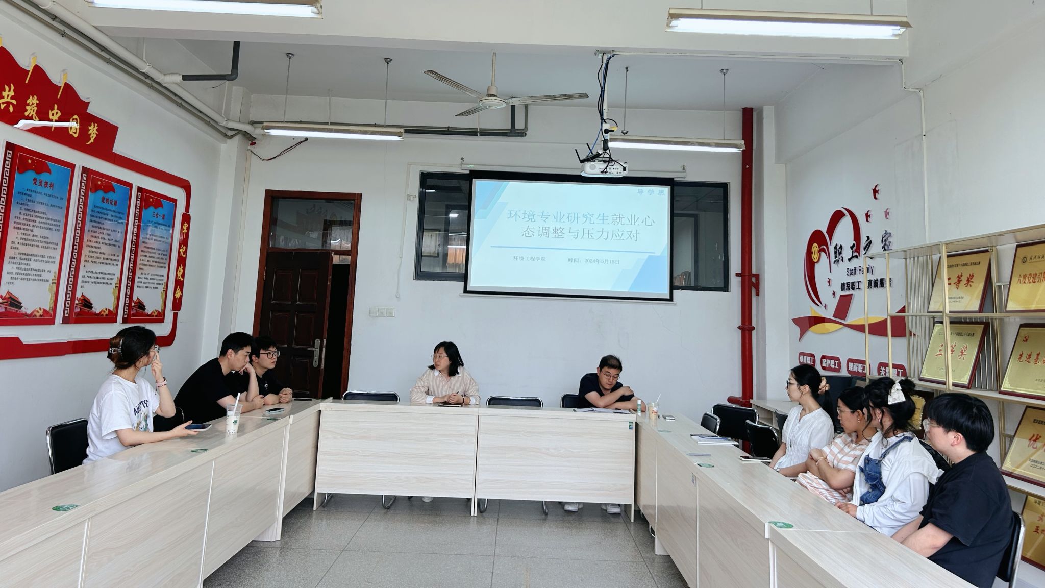 为进一步加强研究生思政教育,深入推进“三全育人”工作。5月15日,学院在崇礼楼205A举办专题“导学思政”活动,聚焦“环境专业研究生就业心态调整与压力应对”。学院党委副书记姚瑶、研究生辅导员李文倩、德育导师叶宇轩、杨璐及2024届硕士毕业生参加。