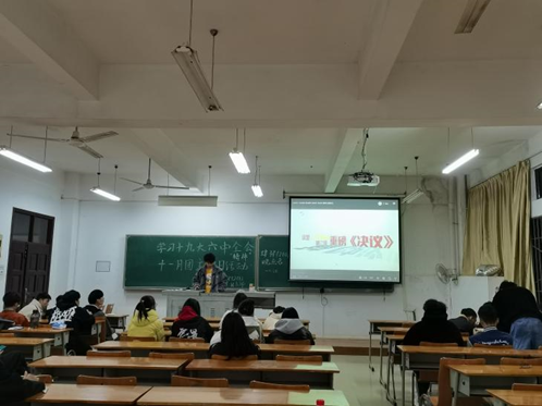 为深入学习党的十九届六中全会精神,把十九届六中全会的精神实践于生活行动当中。学院于11月28日晚在各班班会上协同教师及班长开展了学习《中国共产党第十九届六中全会重要精神》主题团课活动。