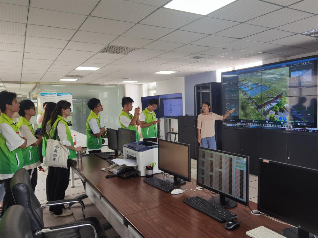 厂区分为管理区、污水处理区及污泥处理区三个区,在接待人员的带领下,团队走进厂区总控室、初沉池、生化池、二沉池等,学习污水处理的全过程。